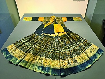 415号棺的墓主为一名成年女性,专家推测这名女性可能是位蜡染高手。“她身上这套衣裙制作耗工耗时、工艺繁复且配色和谐美丽,并非日常便装,或许就是她生前的得意之作。”贵州省博物馆学术委员会主任、研究馆员吴一方介绍。专家根据裙身所用棉质土布,推测其制作时间应为明代。这套鹭鸟纹彩色蜡染褶裙,也成为贵州境内发掘的、我国目前最早的古代彩色蜡染实物。