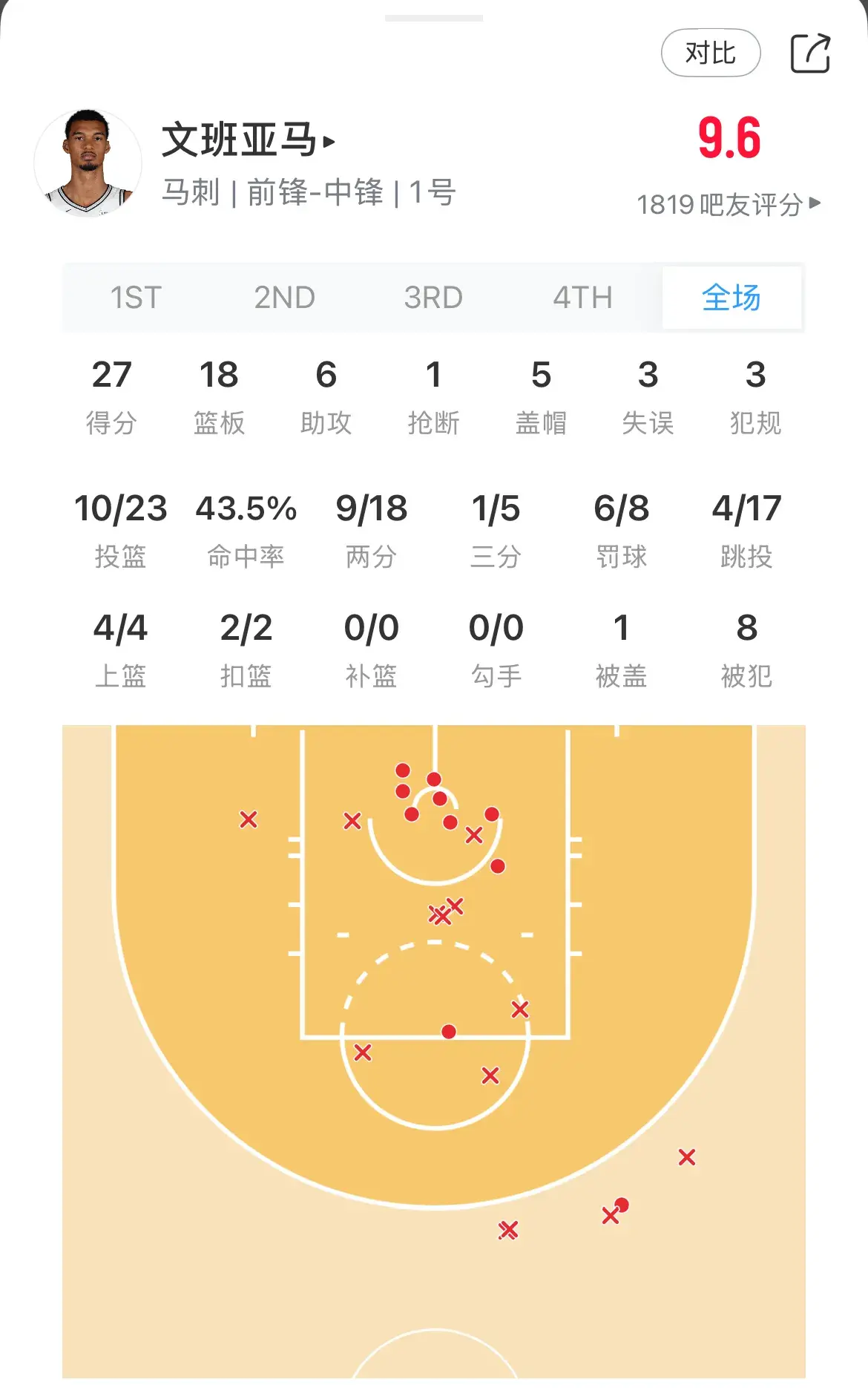 看过比赛会发现,今天文班的手感其实一般,3分球5投1中,整体命中率是43.5%,热火队已经尽全力再限制文班,但是他的能力太强,全场被侵犯8次,盖帽5次,篮板18个,防守威力过大!