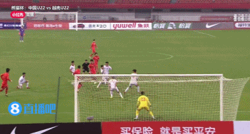 第7分钟,U22国足前场左侧任意球传中,贺一然头球蹭到稍稍顶偏。↓